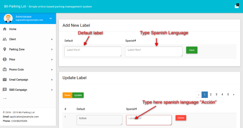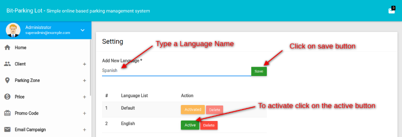 Language setting: Type a language and click on the save button. To enable or disable a language click on active/inactive button. By clicking on the delete button you can delete any language.